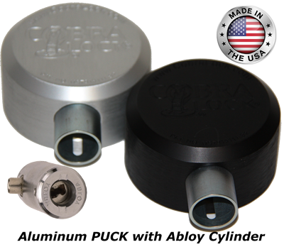 Cobra Lock® ALUMINUM Universal PUCK Padlock® has NO visible shackle and is made of Machined Aluminum. With LsiDepot.com we give you CHOICE. This padlock is comes with the Abloy lock cylinders. Also available in either Silver or Black. Made in the USA.