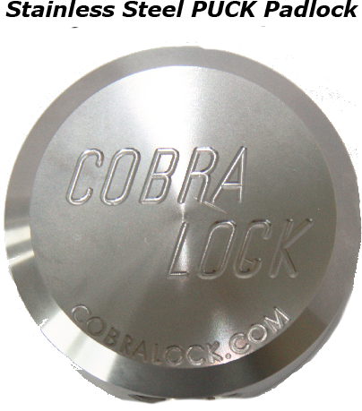 Cobra Lock® Stainless Steel Universal PUCK Padlock. Made of 303 Stainless Steel. Can accept the Cobra 7, Medeco and Abloy lock cylinders. These creates a complete patented padlock.
