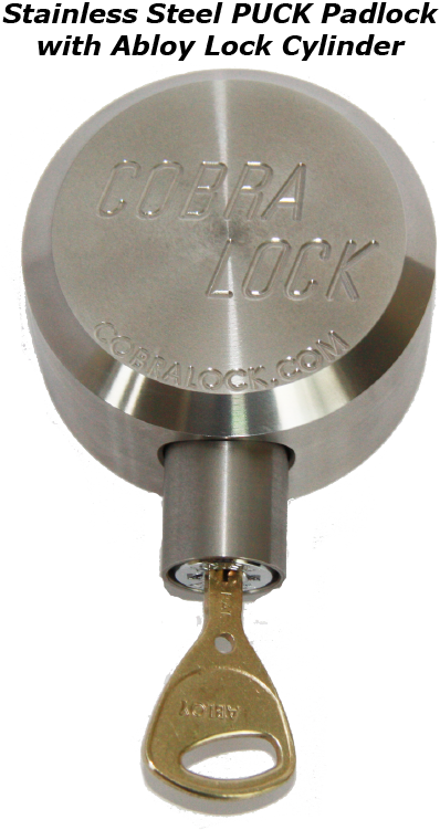 Cobra Lock® Stainless Steel Universal PUCK Padlock. Made of 303 Stainless Steel. Comes with the Abloy Sentry Patented Lock Cylinder. These creates a complete patented padlock.